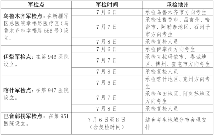 军检工作定于7月6日至8日进行(含复检时间),参检对象为总成绩不低于军检线且政治考核、体质测试成绩均合格的考生。符合军检条件考生,携带身份证、准考证,2张一寸、2张两寸免冠红底彩色照片、《〈国家体质健康标准〉登记卡》参检(详见新疆2025年军队院校招收普通高中毕业生工作流程)。未按规定时间期限参加军队组织的面试、体格检查的,视为放弃报考军队院校。