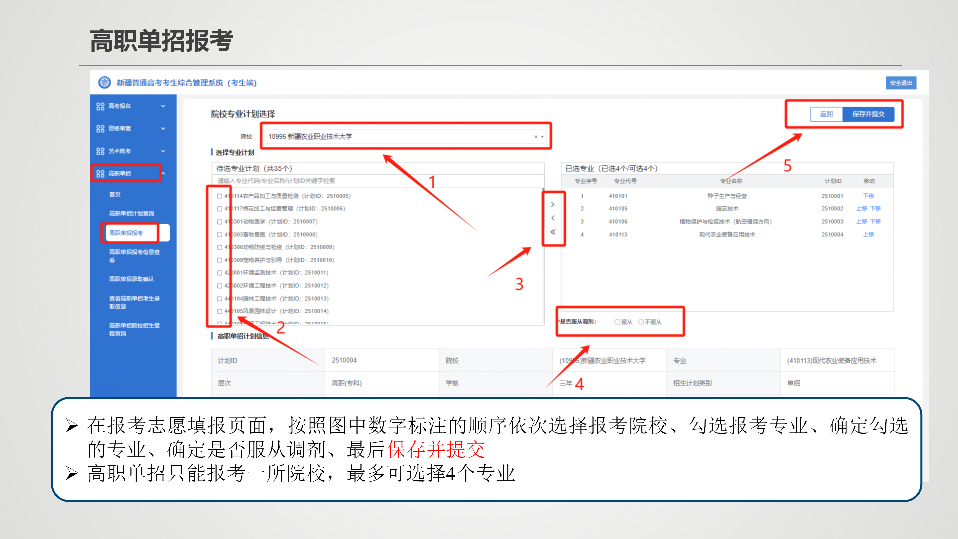 4月8日10时至12日18时,考生可登录自治区教育考试院官方网站(https://www.xjzk.gov.cn,下同),选择“公众服务大厅-网上报名”栏目,进入“新疆高职单招报名”系统,认真阅读“2026年高职单招考生诚信承诺书”并承诺诚信考试,进行网上报名及志愿填报。考生可选择填报一所院校的4个专业,并选择是否服从专业调剂。在规定时间内,考生可在“新疆高职单招报名”系统实时查看各院校动态报名人数并进行志愿修改。考生最终志愿以“新疆高职单招报名”系统最后一次保存的志愿数据为准,填报时间截止后不得更改或补报。
