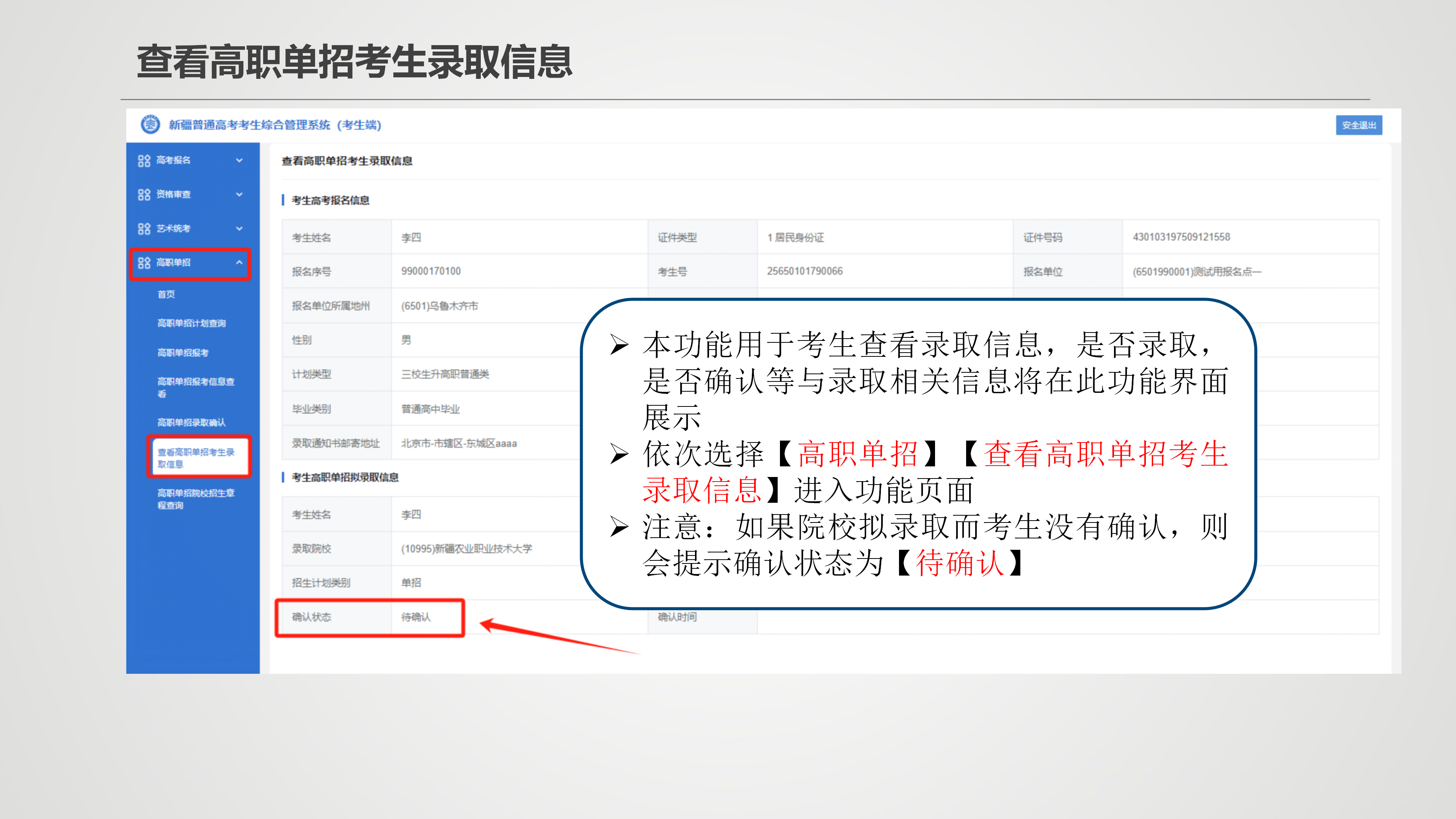 4月20日至25日,各招生院校依据招生章程进行录取、网上公示拟录取考生名单。拟录取考生须于4月26日10时至28日18时,登录自治区教育考试院官方网站,进入“新疆高职单招报名”系统,点击“确认录取”,并通过短信验证后,方为确认录取;点击“放弃录取”和未进行操作的考生,均视为放弃本次高职单招录取。考生确认录取后的名单为招生院校最终录取名单。